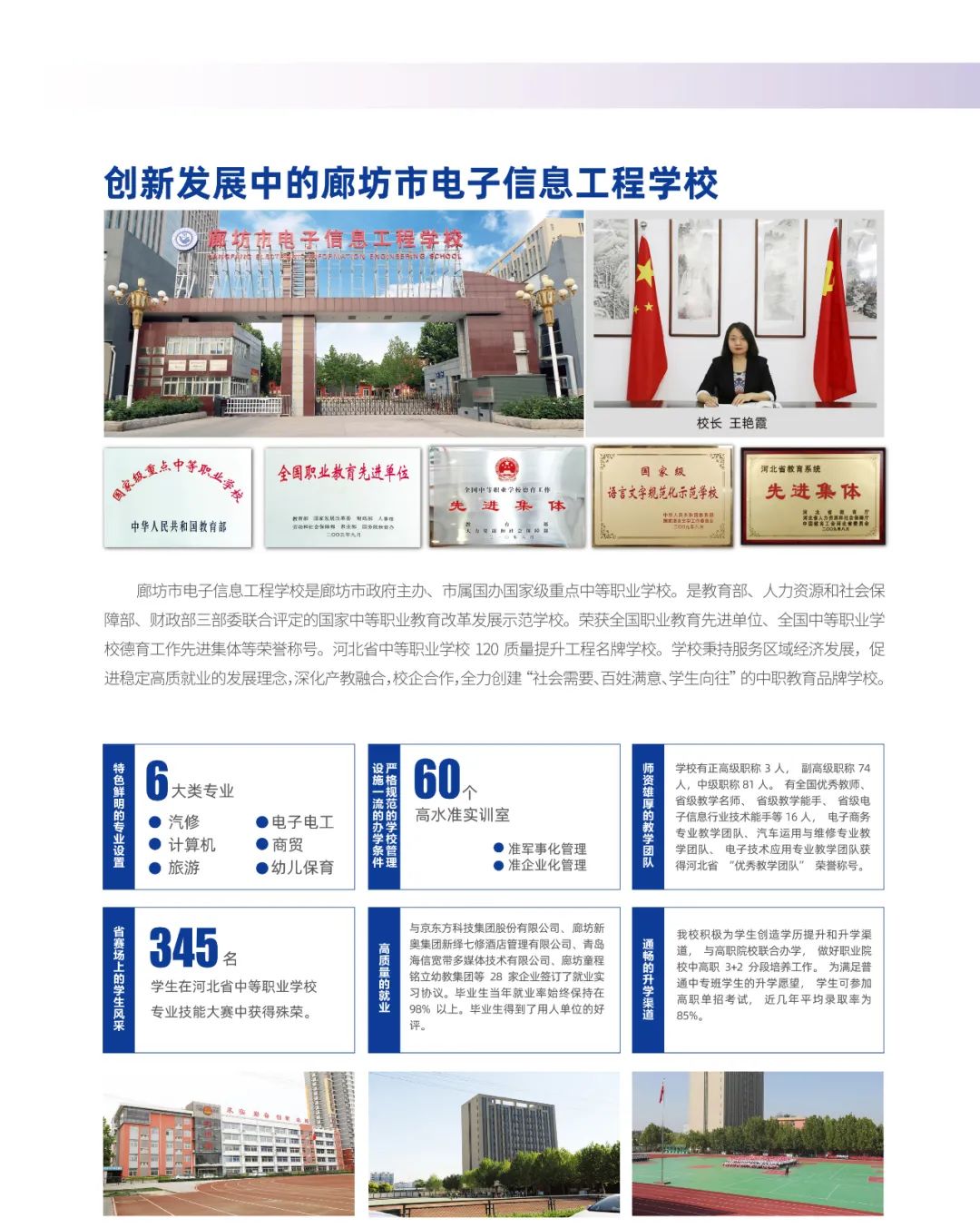 廊坊市电子信息工程学校,又名廊坊市职业技术教育中心,是集普通中专、“3+2”大专和各类短训班为一体的国家级重点中等职业学校,河北省电子信息职业教育集团牵头学校,教育部信息化试点校,廊坊市首所国家中等职业教育改革发展示范校。学校自1991年建校以来,为社会培养了13000多名合格专业人才。毕业生当年就业率始终保持在97%以上。学校还荣获全国职业教育先进单位、全国中等职业学校德育工作先进集体、国家级语言文字工作规范化示范校等殊荣。