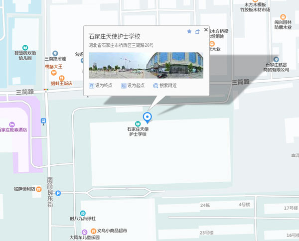 石家庄天使护士学校新校区地址石家庄桥西区三简路28号,比老校区面积更多,设施齐全,宿舍、食堂等均比之前更好了。