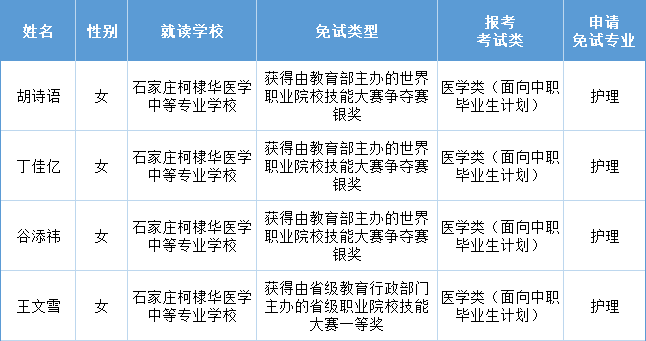 石家庄柯棣华医学中等专业学校传来喜讯,学校胡诗语、丁佳亿、谷添祎、王文雪四名学生凭借出类拔萃的专业素养与全面综合的能力,一路披荆斩棘, 成功被沧州医学高等专科学校免试录取,这一荣耀不仅属于四位同学,更是学校教育教学成果的有力见证。